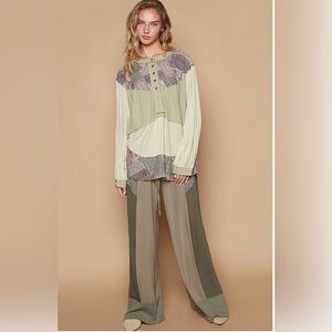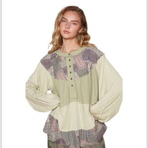 Chic knit top with balloon sleeves. Features sage and cream tones with patchwork accents. Oversized Small