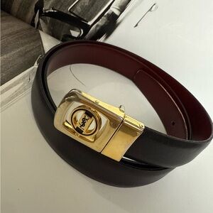 Authentic vintage Yves Saint Laurent reversible belt. Features smooth black leather on one side and rich burgundy leather on the other, finished with a statement gold-tone logo buckle. The buckle is marked Made in Italy, and the leather strap is stamped Made in U.S.A., which is common for vintage YSL belts from this era.