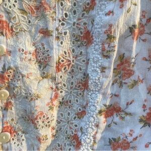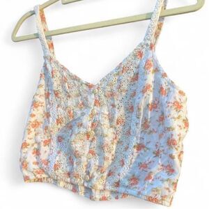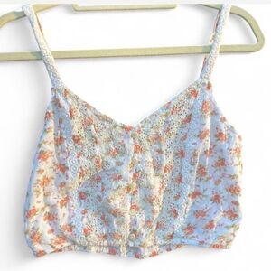Charming floral tank with button-up front. Features delicate lace details. Ideal for a casual day out.