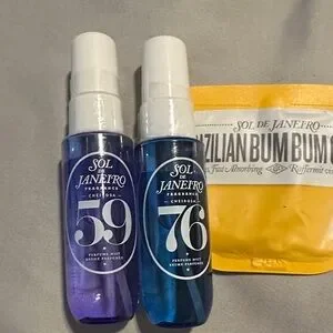 Two Sol de Janeiro fragrance mists in blue and purple bottles. Includes a Brazilian Bum Bum Cream sample.