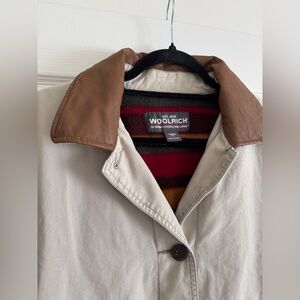 Timeless Woolrich field jacket crafted in a durable cotton canvas shell with a cozy striped fleece lining for warmth. Features a rich brown leather collar, classic button-front closure, and oversized utility pockets.