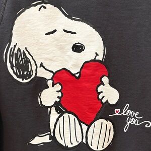 It’s a Hanna for Valentine’s Day! Boy or girl cozy black sweatshirt featuring Snoopy hugging a red heart and “love you” script. Non smoking home. Worn by one child.