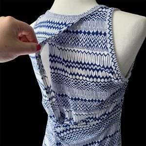 Stylish midi dress with a sleeveless design. Features a blue and white pattern. Perfect for casual outings.
