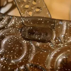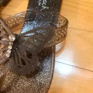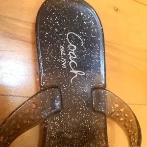Retired style Coach Butterfly Jelly Sandals. Black with metallic glitter. Gorgeous rhinestone butterflies on top. The tiniest little step heel and textured bottoms.