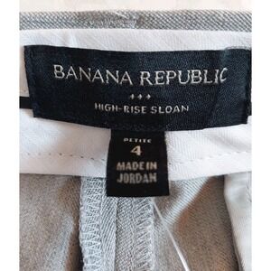 The product is a pair of Banana Republic Woman's High Rise Sloan Pants in Heather Gray, size 4 petite. This slimming and stretchy pair of pants features a flat front design. Made from a blend of polyester, spandex, rayon, viscose, and cotton twill fabric, these pants are suitable for various occasions. The high rise style with a cropped 26-inch inseam and straight leg design make them a versatile and stylish addition to any wardrobe.