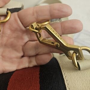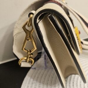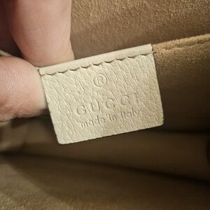 Beautiful authentic Gucci mini shoulder bag in cream pebbled leather with the signature red/blue Web stripe and the iconic yellow enamel butterfly detail. Comes with the detachable wide canvas Gucci logo strap for crossbody or shoulder wear. A rare statement piece that’s no longer sold in stores.