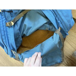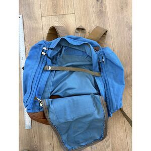 Vintage 1980's 1990's Blue nylon thick leather bottom strappy Daypack Outdoor backpack