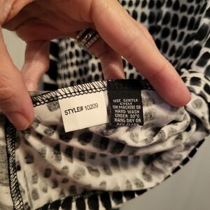 This LYNN RITCHIE SILVER top features a striking black and white pattern and a criss cross lace up back with black mesh cut out. It has a relaxed silhouette with three-quarter length sleeves and a flattering scoop neck, making it suitable for both casual and work occasions.