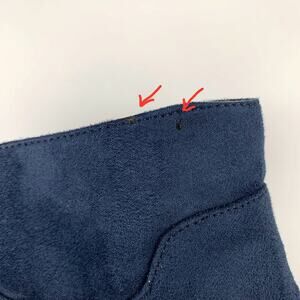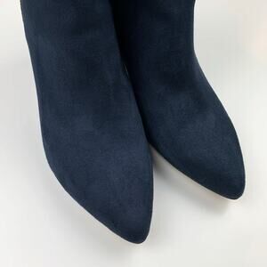 Tommy Hilfiger Hazelle ankle boots in women's size 9.5M. Dark blue faux suede. Zipper. Block heel. Pointed toe. Light wear and a small flaw near the top edge. Please see picture.