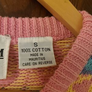 Vintage 80s/90s Brass Plumb Cotton Sweater in amazing pastel print. 100% cotton (zero itch!) and def fits oversized for a small. Colors photograph slightly darker than IRL esp the mint green squiggles that appear more turquoise in these pics.