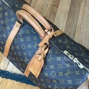 Stylish travel bag with classic monogram design. Features sturdy leather handles and accents. Zipper sticks a little on one side. Doesn't effect loading or unloading.Perfect for travel.