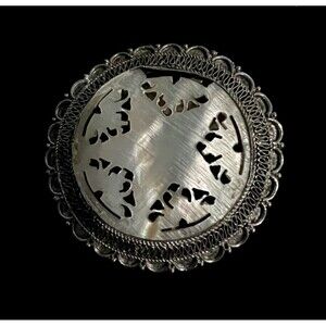 This vintage brooch pendant, made of 950 sterling silver, boasts a round shape with a beautiful mother of pearl gemstone in white color.