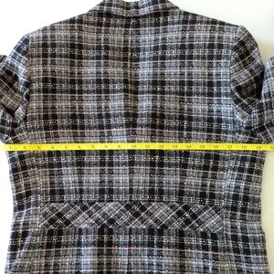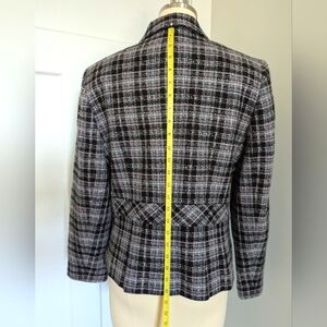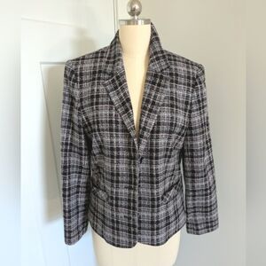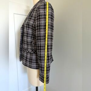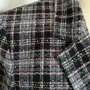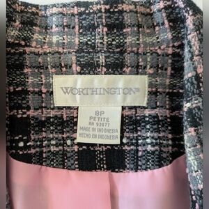 This Worthington blazer features a classic plaid pattern in black, grey, white and pink. Perfect for adding sophistication to any outfit. The tailored design and structured silhouette make it an excellent choice for both business and casual occasions.