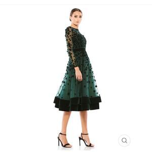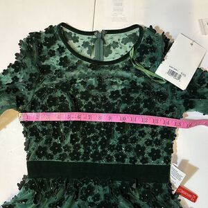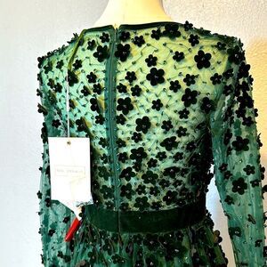 Tulle overlay skirt and intricate velvet floral accents and beading throughout. Embellished mesh overlay fabric. Emerald color. See photos of measurements for accurate sizing. All measurements are approximate