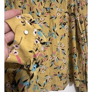 The Maeve Anthropologie Meadowsweet blouse in size 2 is a stylish and vibrant yellow floral top perfect for casual occasions. This blouse features a high neckline with a keyhole design, button closure, and a stand-up collar style. Made from 100% viscose fabric, it is lightweight, soft, and breathable, making it ideal for wearing during the summer, fall, and spring seasons. With a feminine floral pattern and shirred sleeves, this blouse from Maeve is a trendy and comfortable addition to any woman's wardrobe.