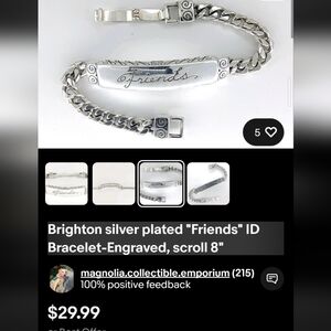 ✨Show off your friendship with this stunning silver plated "Friends" ID bracelet from Brighton. The round shape and push lock closure make it a perfect accessory for any occasion. The bracelet features a Cuban link chain and an engraved scroll design, adding a touch of elegance to your overall look. The 7-inch length is perfect for any wrist size. This Brighton bracelet is signed and made of silver plated metal. It's a great addition to your fashion jewelry collection and a perfect gift for your best friend. In pre-owned, very good condition.