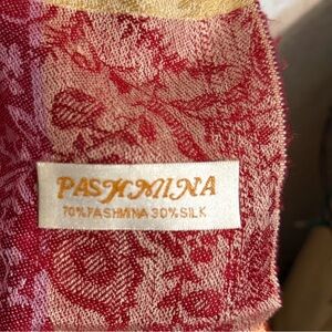 Beautiful Pashmina Shawl Can be worn as a scarf, shawl, or wrap. Pink, blue, brown, orange, and green. The color is even more brilliant in person. 70% Pashmina 30% Silk Approximately 66" by 26 1/2" The tassels are approximately 3 1/2" long In good pre-owned condition.