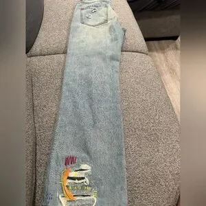 Stylish light blue jeans with unique embroidery. Perfect for casual wear.