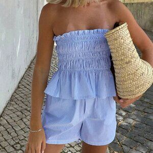 Blue Boho Women's striped Beach Vacation Tube top and Shorts