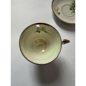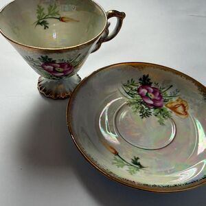 The cup and saucer shimmer with an iridescent pearl finish, hand-painted poppies in soft magenta and gold, and delicate gilded edges. The pedestal foot and ornate handle add just the right touch of mid-century romance.