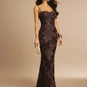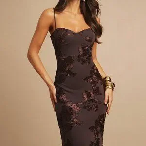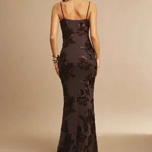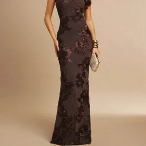 This long sleeveless dress features a stunning brown 3D floral design, perfect for party occasions. With its slim fit silhouette, this sexy maxi dress is sure to turn heads.