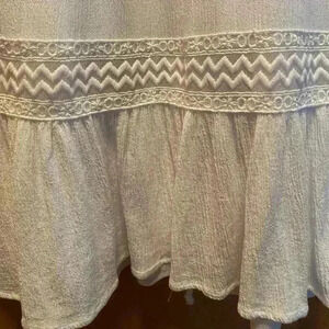 Maurices Dress. Gauze with lace trim front detail. Ruffled bottom with lace. Sleeveless. Tie at waist back for a fitted look. Peak a boo back neck with button and loop closure. Fully lined. Light weight. Color: white. Size Small. 100% Rayon, Lining 100% Polyester. No rips, tears or stains. White is hard to photograph. Show a slight pink hue. No stains. Pure white color. Pet free smoke free environment. Measurements laying flat: Armpit to Armpit 17”, shoulder to hem 33”, waist 16”. Waist to hem 18.5”. Pet free smoke free environment.