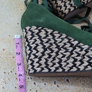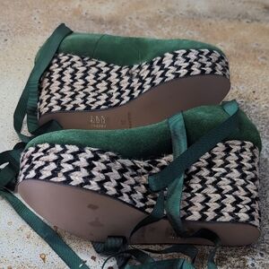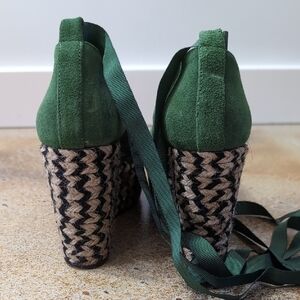 Stylish green wedges with a woven espadrille platform. Perfect for a bold look. Ribbons tie up the calf.