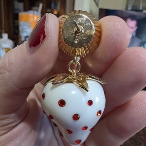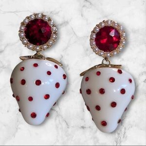 Playful strawberry-shaped dangles in glossy white enamel-style resin, dotted with vibrant red rhinestones.