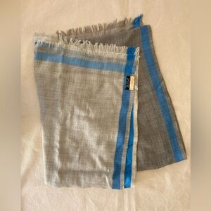 Elevate your style with this elegant gray and blue striped scarf. Perfect for any occasion, this accessory adds a touch of sophistication to your outfit. Large but lightweight! In good used condition with no apparent holes or stains.