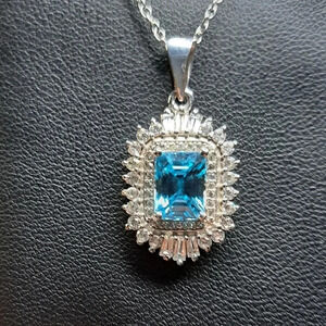 Stunning Premium Cambodian Mined Natural Blue Zircon and Natural White Zircon Ballerina Halo Pendant On 18" Chain Necklace in 925 Sterling Silver Stamped.