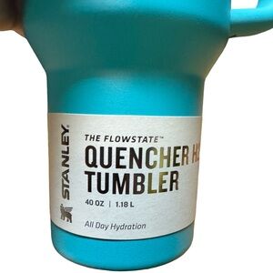 Stanley tumbler in a striking teal shade. Ideal for all-day hydration.