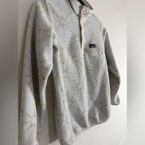 Soft fleece jacket with a stylish gold pattern. Features a snap-button collar and front pocket.