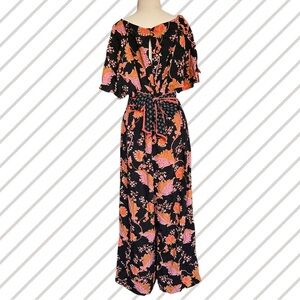 Maeve for Anthropologie Black w/ Orange & Coral Floral Belted Botanical Jumpsuit