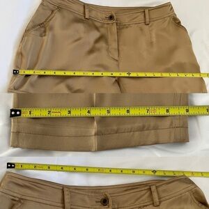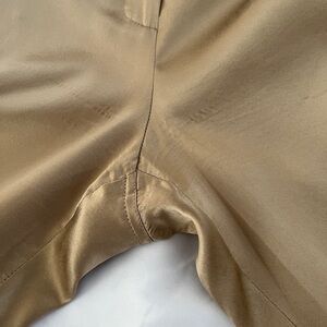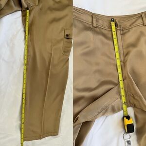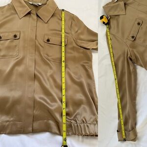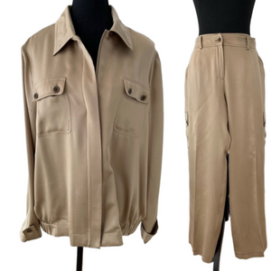 Nygard Collection 100% silk bomber style jacket and cargo pants. Tan colour.. Jacket: full zip front, collar, two front pockets with buttons and decorative sleeve straps that also have buttons. Cargo Pants: button and fly closure, side pockets, belt loops, pocket with buttons on the back and on the sides of both legs. Dry cleaned before listing.