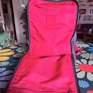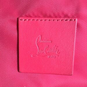 Stylish Christian Louboutin backpack. Features purple exterior with black logo pattern. Perfect for everyday use.
