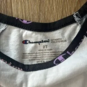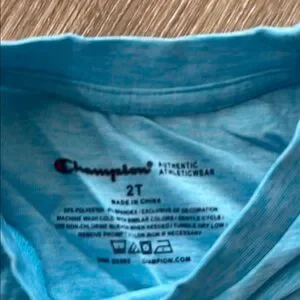 Comfortable and stylish Champion kids active wear set featuring a blue top and white top and black shorts.