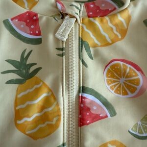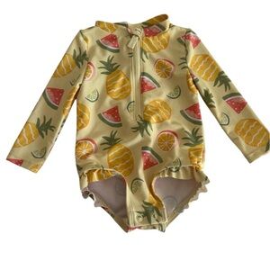 This Carter's rashguard swimwear combines vibrant yellow and green hues with a playful fruit pattern, ensuring a fun and protective swim experience. Designed with long sleeves and a high neckline, it offers excellent sun protection while maintaining a snug and comfortable fit for active days in the water. Zipper front with flap to protect chin. Ruffle leg opening with two snaps at bottom for easy diaper change. Color: Yellow with fruit design. Pineapple, Watermelon, Orange and Lime. Size 6 month. Pet free smoke free environment.