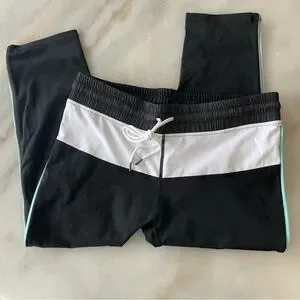 Comfortable and stylish leggings. Black and white design with aqua accents. Perfect for active kids.
