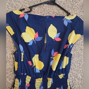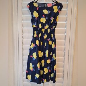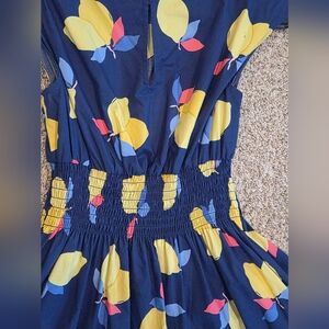 Women's size 4 Kate Spade Lemon Zest Blaire Dress in navy blue with a yellow and multi-color lemon print. Boat neck, cap sleeves, smocked waist, flared skirt, back keyhole and button closure, navy slip lining, pockets(!), and a lightweight 100% cotton exterior in a pretty lemon print on a navy blue ground. In perfect condition. Such a beautiful slimming flattering dress.