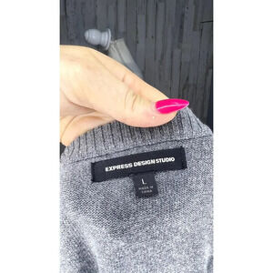 This Express Design Studio pullover sweater in size L is designed for women. It features a classic argyle pattern in gray with a V-neck and long sleeves. Made from a soft and comfortable fabric blend, it offers a versatile and elegant style suitable for various occasions, from casual outings to office wear. The sweater is in pre-owned condition.