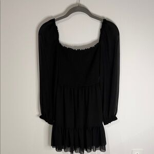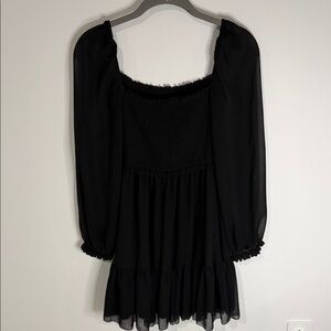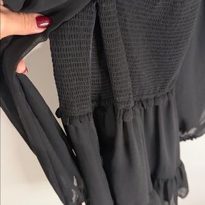Keywords: Wilfred dress, black mini dress, smocked bodice, bishop sleeves, tiered hem, sheer sleeves, square neck, feminine, romantic, evening wear, cocktail dress, chic, elegant, party dress
