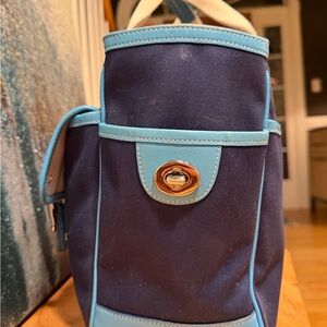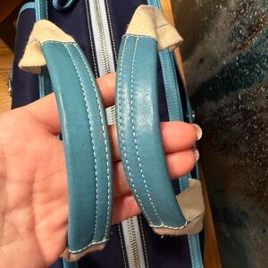 A beautiful and roomy vintage Coach tote in excellent condition, blending classic style with practical design. This is the sought-after #6734 style from the early 2000s. The durable navy blue canvas twill is accented perfectly with eye-catching light blue leather trim and sturdy, webbed handles. All hardware is a cool silver-tone finish.