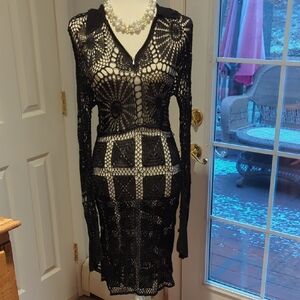 Chic black crochet dress with long sleeves. Perfect for stylish occasions.