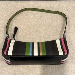 Beautiful Vintage Kate Spade Handbag. Fabric, suede and leather materials. Black leather bottom, trim and black/green strap. Silver tone metal for zipper and other hardware. One small zipper pouch inside. The interior is green suede. Stripe colors are pink, black, gray, white, green, blue and tan. Measurements- 11 x 4 x 4, strap drop is 9 inches. Can be worn on shoulder or carried by hand. Comes with original Kate Spade white and green dust bag. Purchased from Neiman Marcus. This bag is in exquisite condition! ππ€