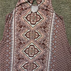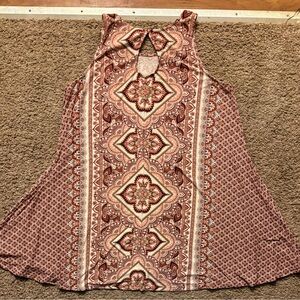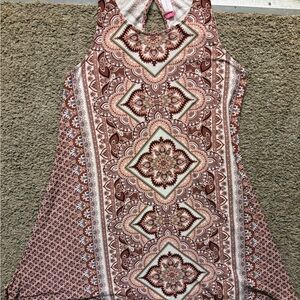 This is a well known brand, has great selection of juniors size clothing!! This dress is a junior XL(15-17). It’s sleeveless and has a flare fit, twirls when you walk!! There is a keyhole cut out in the back. The dress is a mixture of different shades of brown paisley print!! It’s in brand new condition. It could be worn by a woman who is size XS-S as well.
