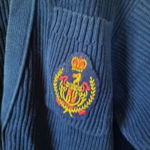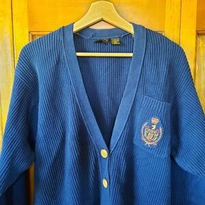 Vintage Liz Sport 100% Cotton Navy Blue Ribbed Knit Preppy Cardigan Sweater. V-neckline with full button front closure, ornate gold metal buttons, long roomy sleeves, chest pocket with embroidered patch, 2 front hip pockets, longer tunic length, all-over ribbed knit, and a straight hemline. In great condition! Medium weight material 100% cotton. Size medium.
