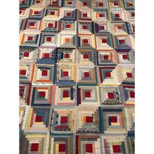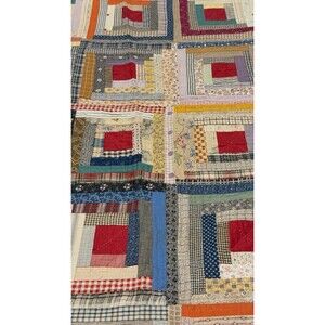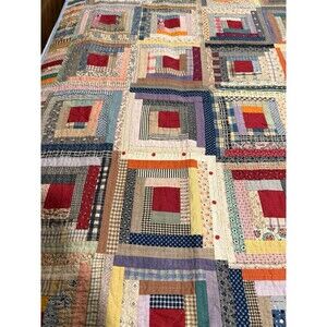 This Antique Log Cabin Quilt is a reversible twin/full size quilt featuring a beautiful blue trim and floral back. Handmade with a traditional log cabin pattern, this quilt is made of cotton and provides insulation for all seasons. Perfect for any room in the house, this unique piece adds a touch of vintage charm to your decor. With its reversible design and antique style, this quilt is a versatile and stylish addition to your bedding collection.