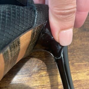 Georgian Goodman black straps stiletto sandal size EU 36.5 US 6 in good does have some wear, see picked for detail. In the back of the heel at the top of it small damage , not even noticeable when worn.