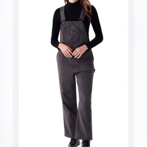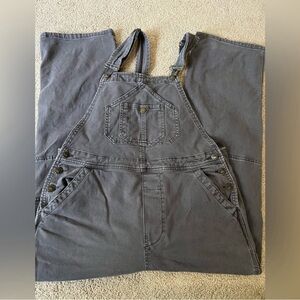 Stylish grey denim overalls. Features adjustable straps and front pocket. Perfect for casual wear.
