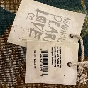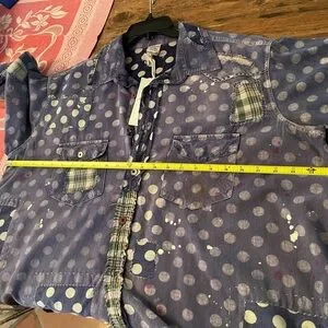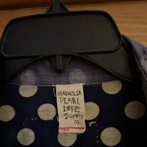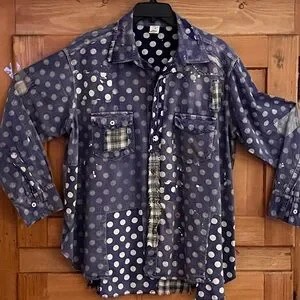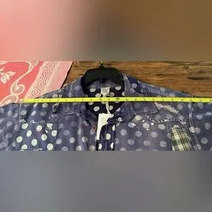 Magnolia Pearl navy/white polka dot western cut shirt. Features patchwork, fading, mending and distressed details. Mixture of buttons and snap closures. This shirt runs smaller than some MP shirts. Approximately 20” shoulder to shoulder and 25” across bust.